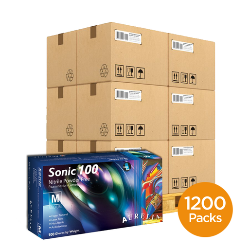 This is a pallet deal of 1200 Packs of Gloves (120 Cases) Aurelia Sonic 100 is a high-quality super thin Cobalt Blue/ Purple Nitrile examination gl...